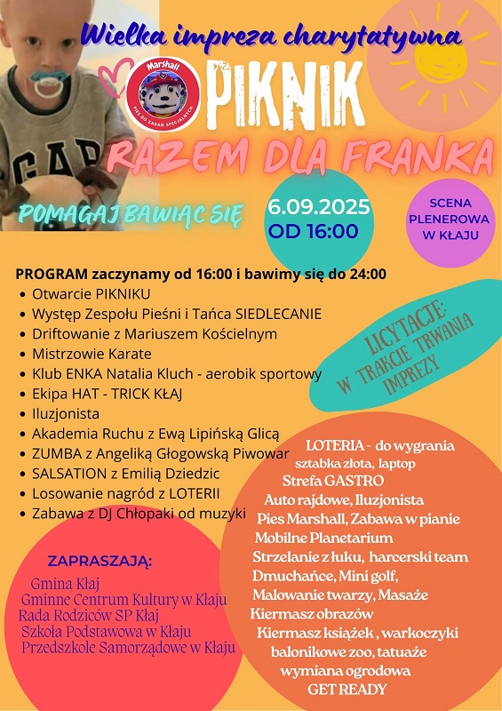 6 września 2025 roku w dniu „Wielkiej imprezy charytatywnej – Piknik razem Dla Franka”. W Gminnym Centrum Kultury w Kłaju zorganizowano akcję krwiodawstwa. Zgłosiło się 21 osób po badaniach lekarskich krew oddało 15 osób. Pozyskano około 7 litrów krwi, tego bezcennego leku. Wszystkim bardzo serdecznie Dziękujemy.